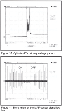 However, now there was a connection. Back in the shop, Aaron compared coil primary voltage to the MAF sensor signal low line. Figure 10 shows cylinder #8’s primary voltage pattern, while Figure 11 shows more noise on the MAF sensor signal low line. I think you will agree that this is more than just a coincidence.