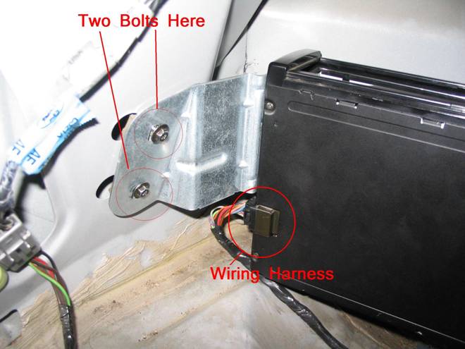 Next, unbolt the CD changer from the car, and unplug the harness to the RCU