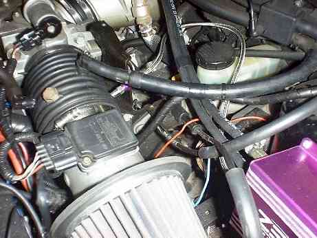 | If you look closely you will see the braided stainless steel line that goes into the rubber tube connecting the MAF and the throttle body. This is the nitrous spray nozzle, containing the nitrous jet. | ![]() |